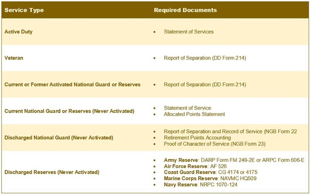 - Current or Former Activated National Guard or Reserves – Report of Separation (DD Form 214)